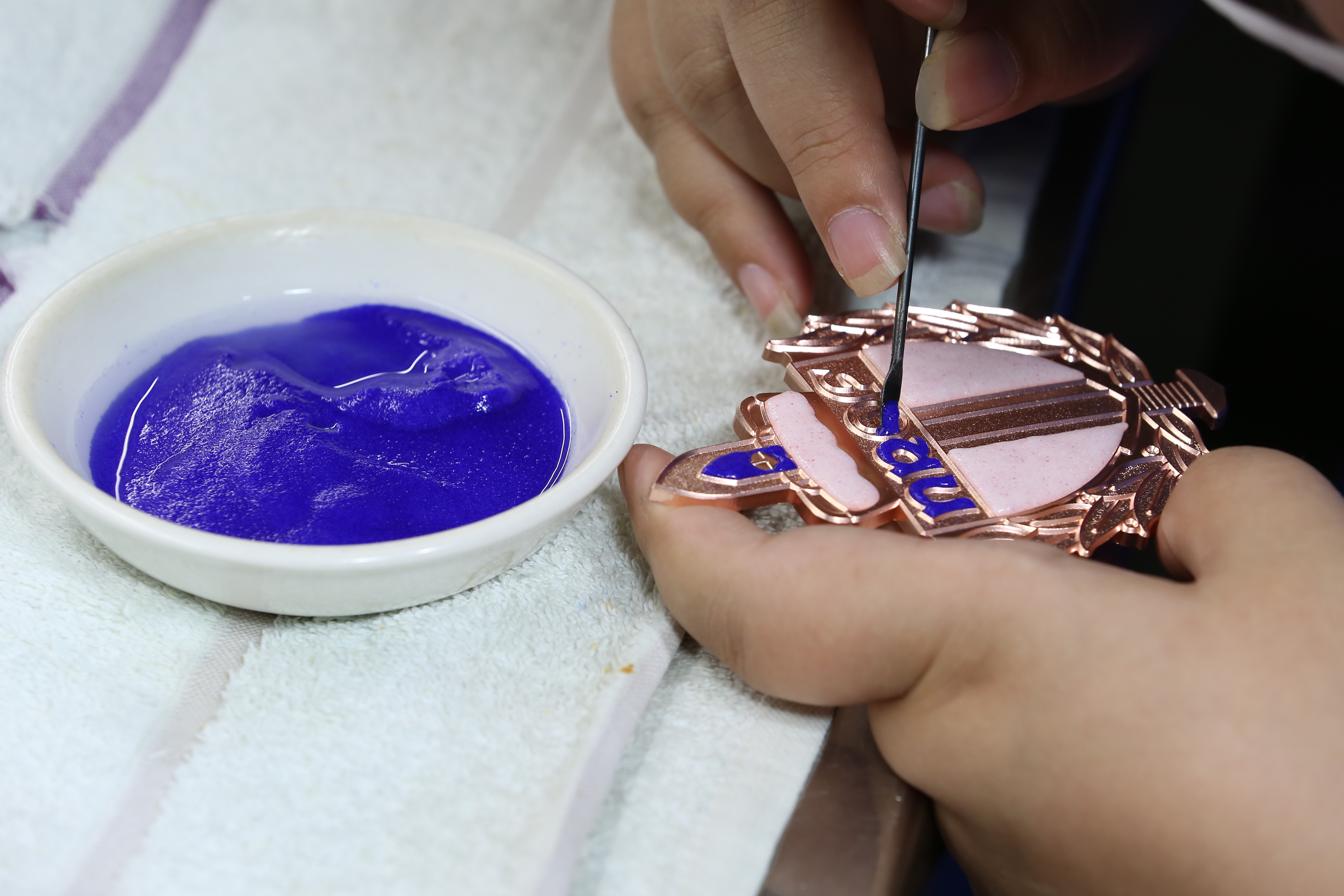 琺瑯徽章的制作流程:制圖——曬版——咬模版——刻模——切模——壓沖——上色——高溫燒制——磨石——修補——拋光——焊配件——電鍍——品檢——包裝